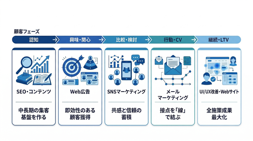 次章ではWebマーケティングを継続的に成果へつなげるための体制と構造の考え方を踏まえながら、代表的な施策とその役割を整理していきます。