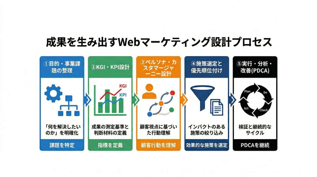 成果を安定的に出すためには、Webマーケティングを「施策実行」ではなく設計プロセスとして捉えることが不可欠です。